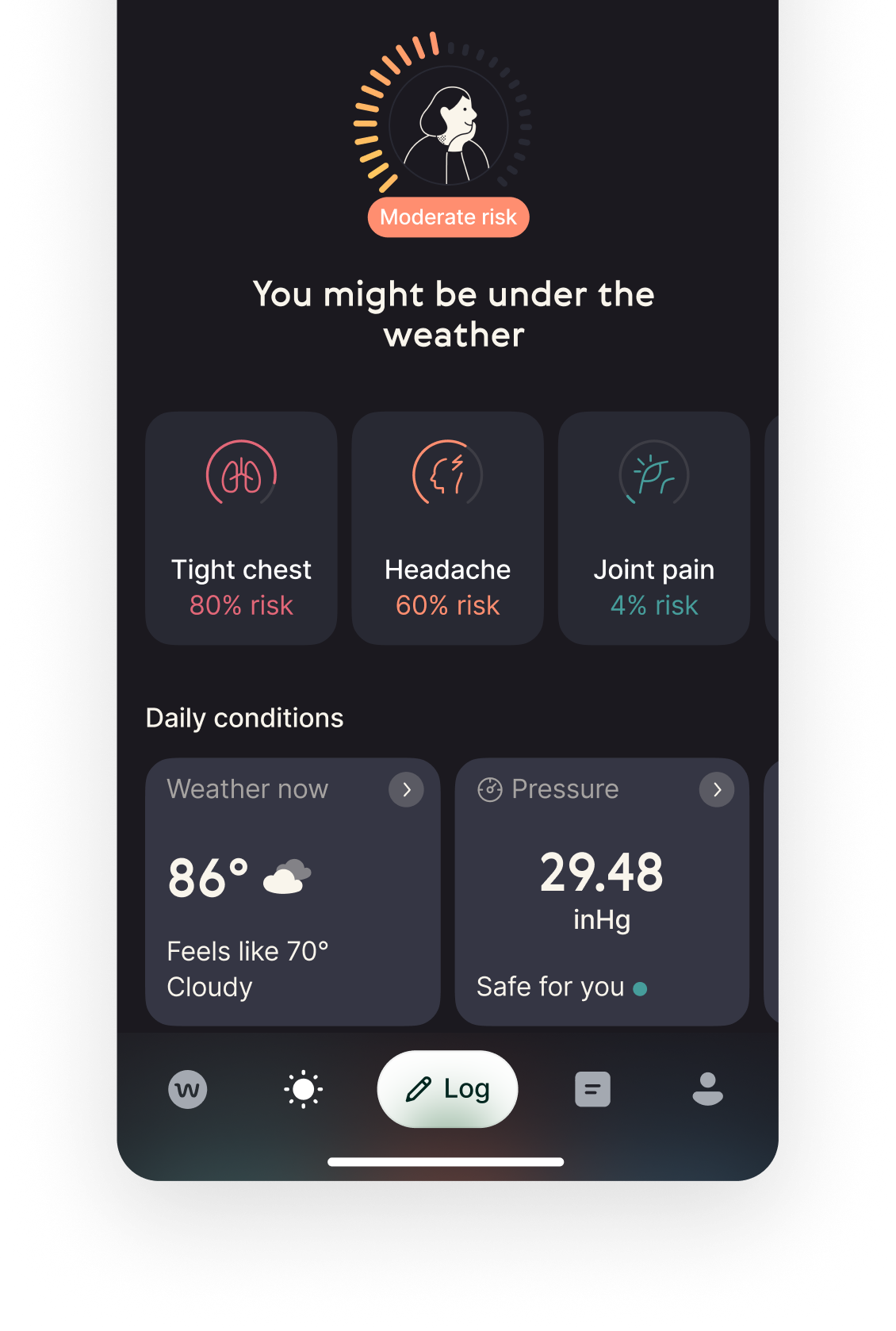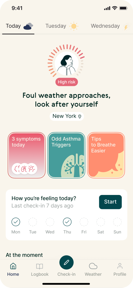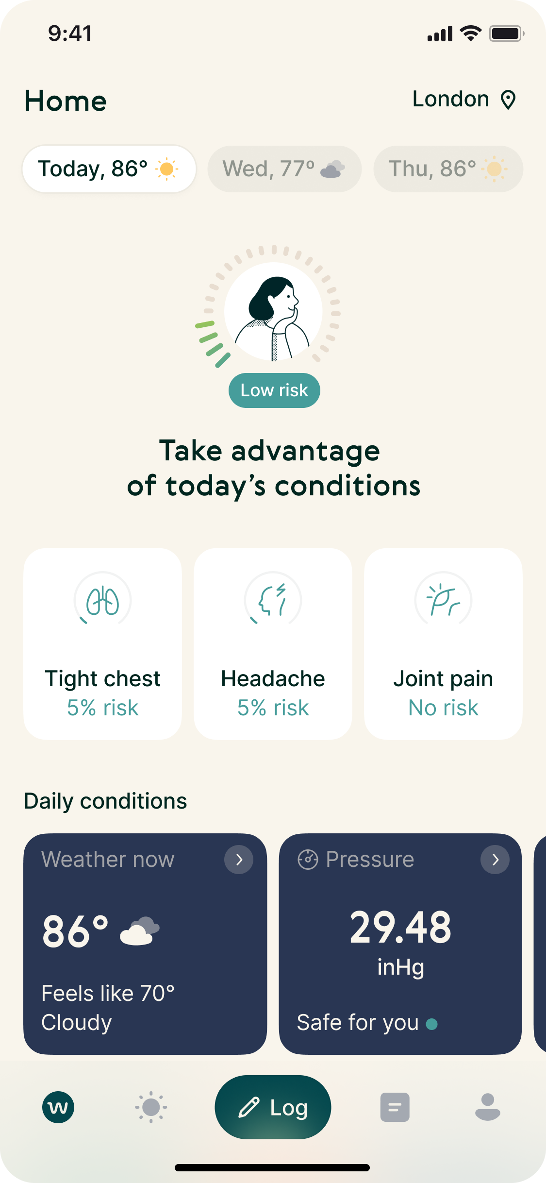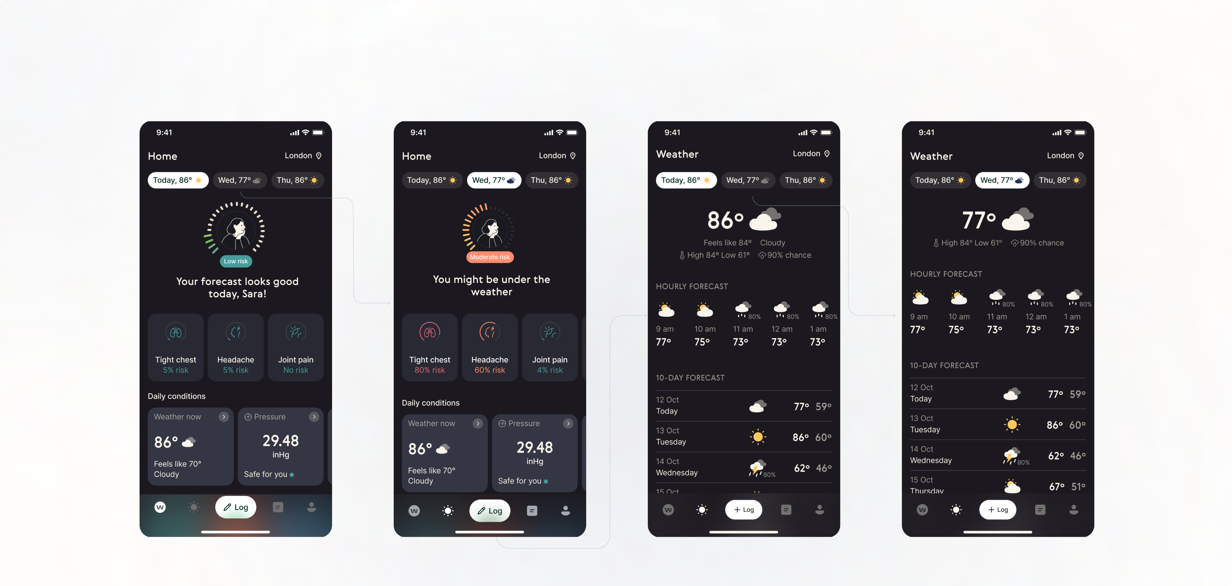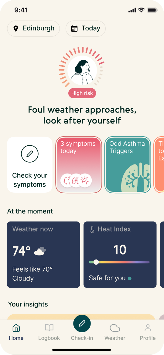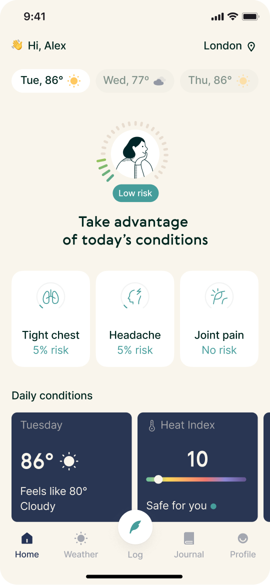 WeatherWell is an iOS app for weather-sensitive people built around personalised forecasts and medically reviewed health guidance. Retention depended on delivering relevant health guidance and that required users to log symptoms consistently. Without seamless logging, the system couldn’t generate meaningful insights.