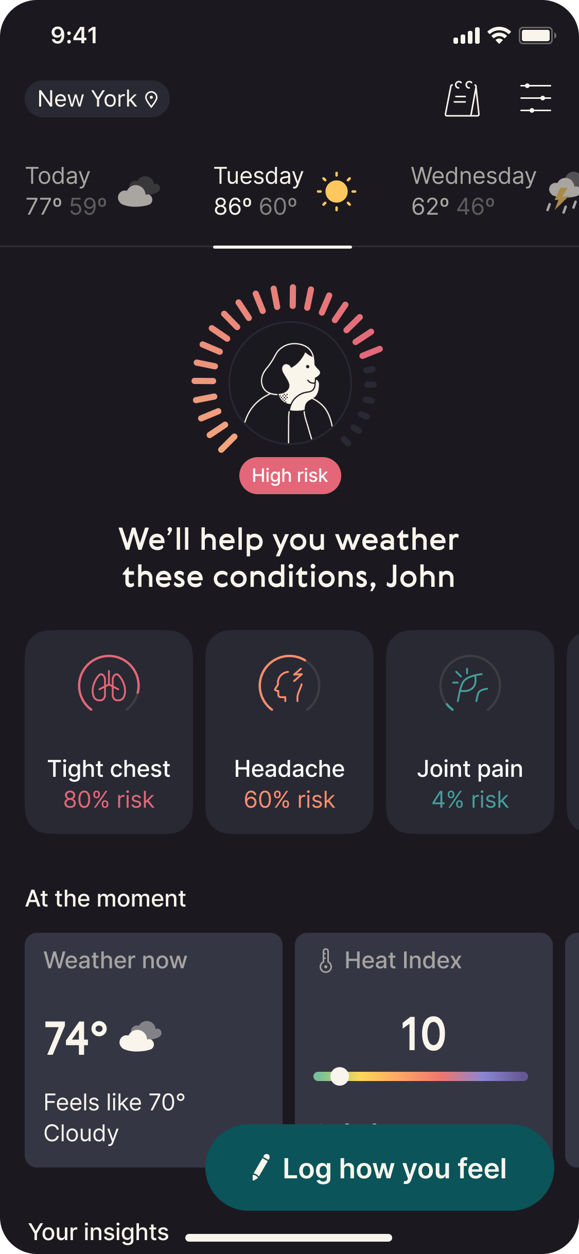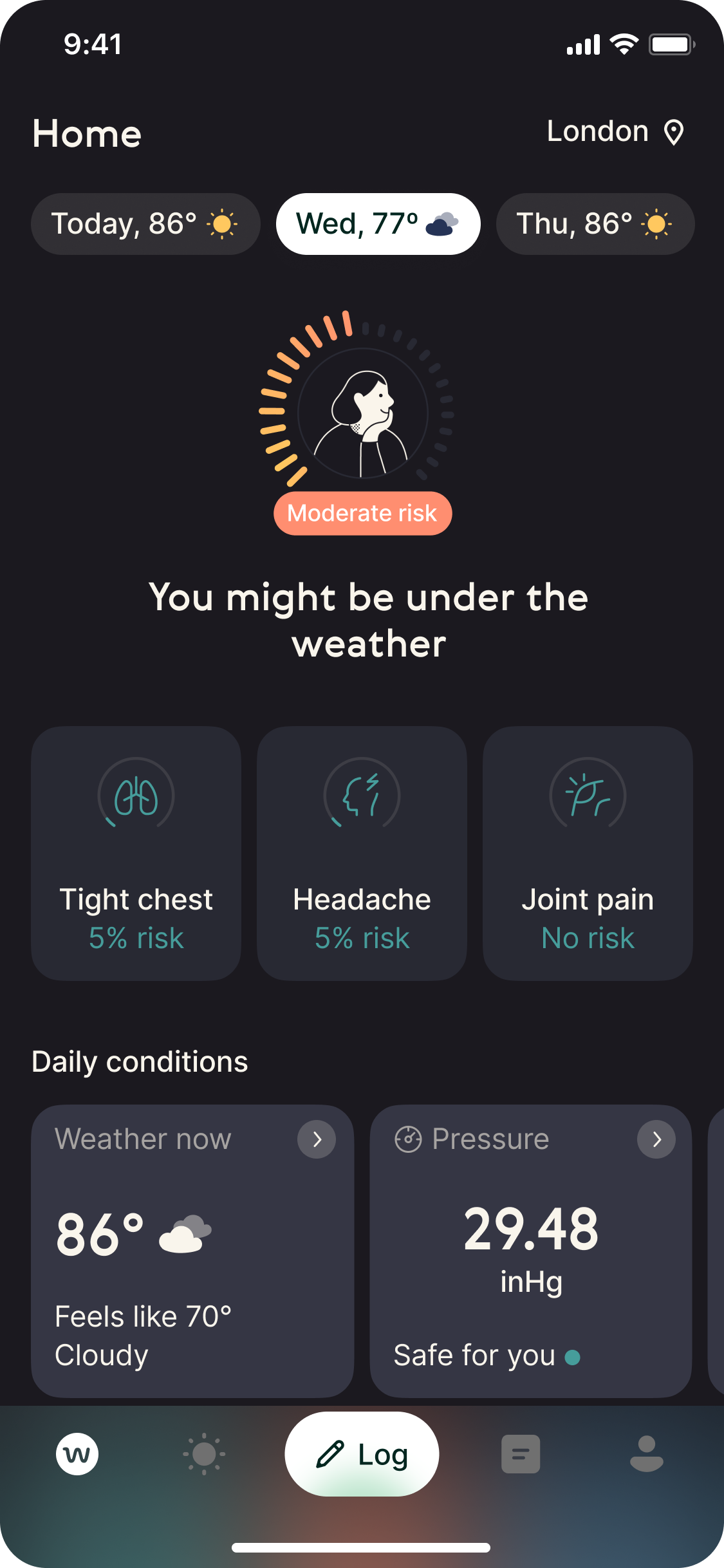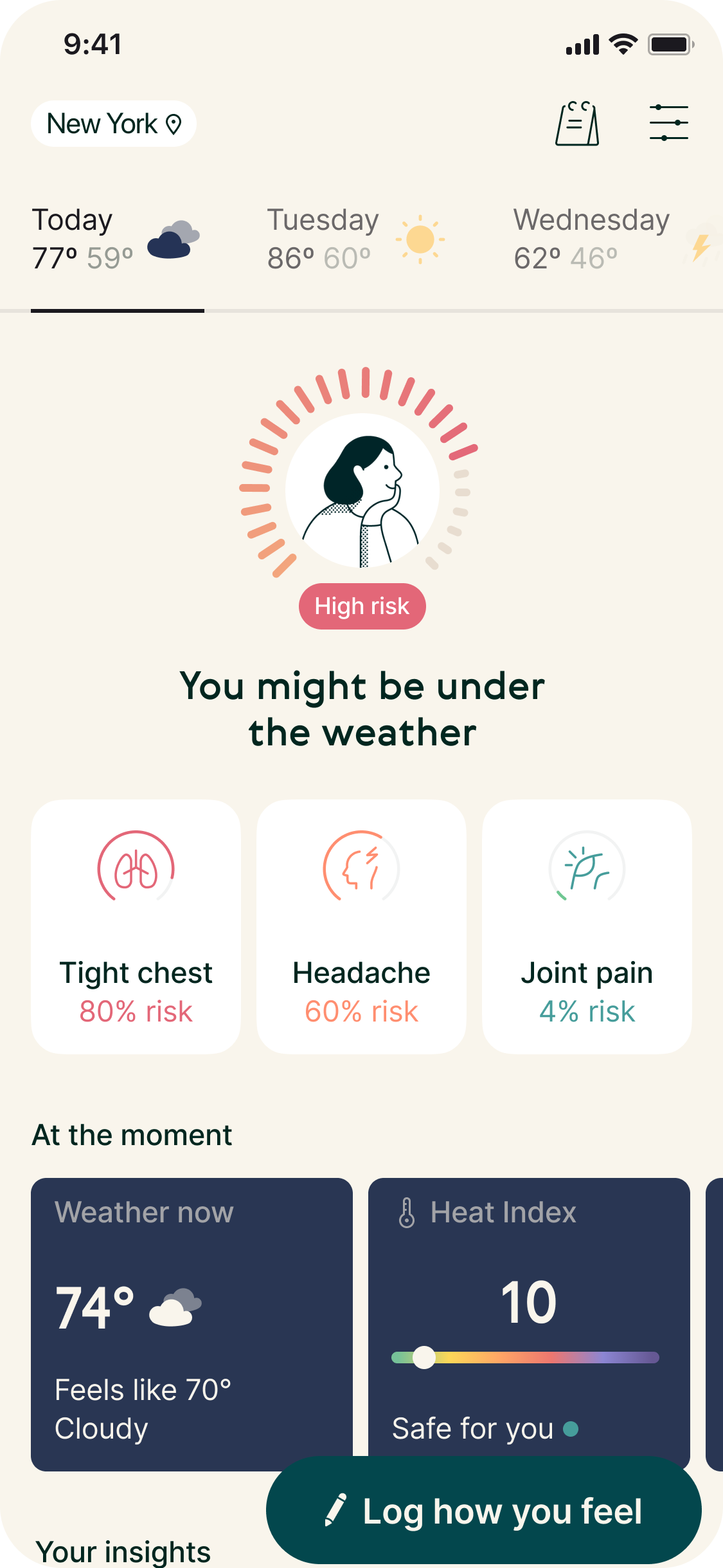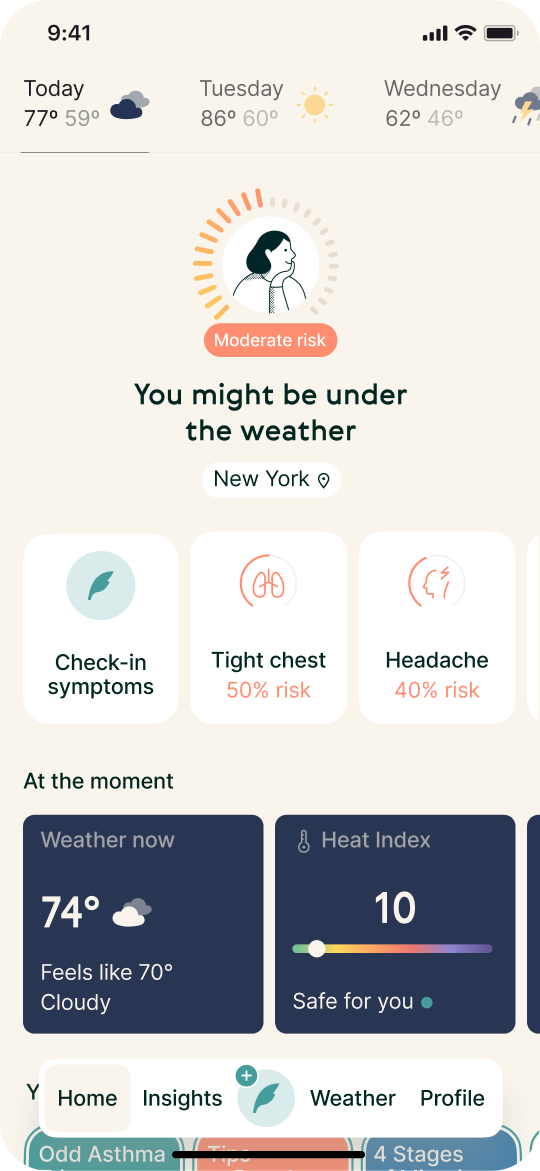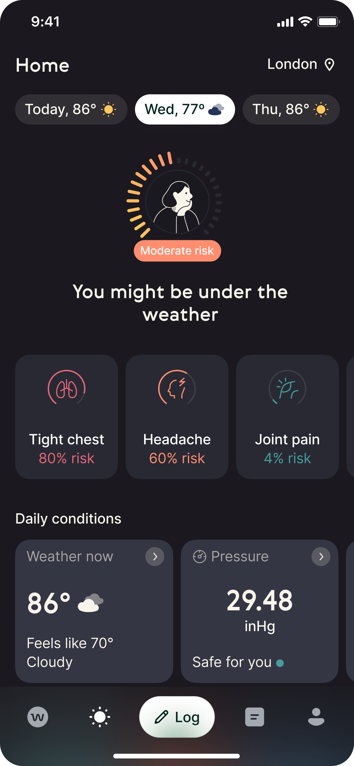 WeatherWell is an iOS app for weather-sensitive people built around personalised forecasts and medically reviewed health guidance. Retention depended on delivering relevant health guidance and that required users to log symptoms consistently. Without seamless logging, the system couldn’t generate meaningful insights.